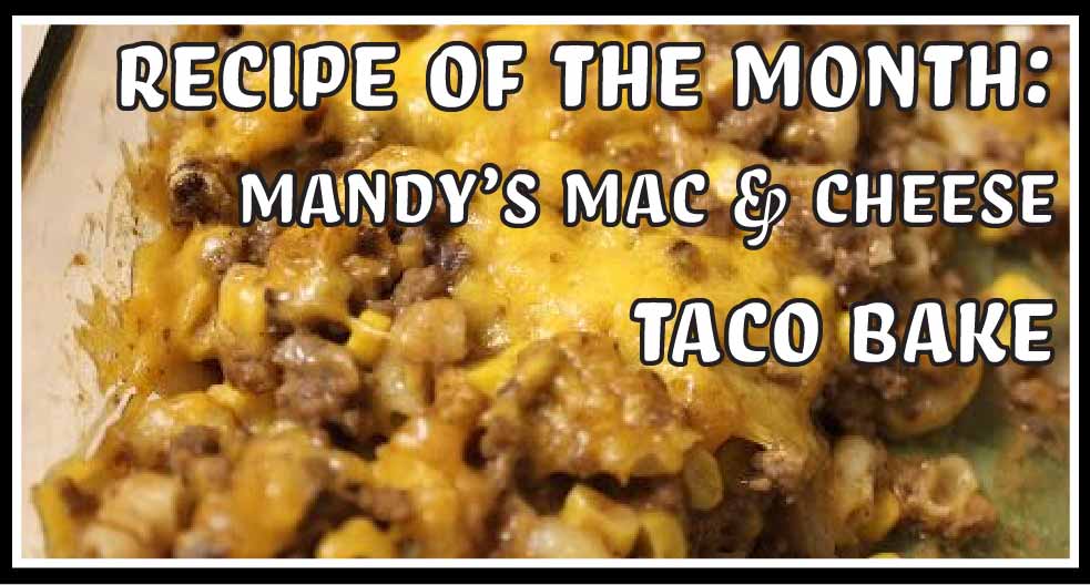 Brown 2 lbs of hamburger meat. Drain and mix 2 packets of taco seasoning in. Cook 3 boxes of shell mac ‘n’ cheese as directions state. Mix in 2 cups of sour cream with mac ‘n’ cheese. Layer mac ‘n’ cheese/sour cream mixture in bottom of casserole pan. Layer taco hamburger meat on top. Sprinkle 16oz frozen corn. Sprinkle with shredded cheddar cheese. Next, layer another layer of the mac ‘n’ cheese sour cream mixture on top (like you are making lasagna). Cover with aluminum foil. Bake for 15 minutes. Take out and sprinkle more shredded cheese on top and bake for another 5 minutes, uncovered.